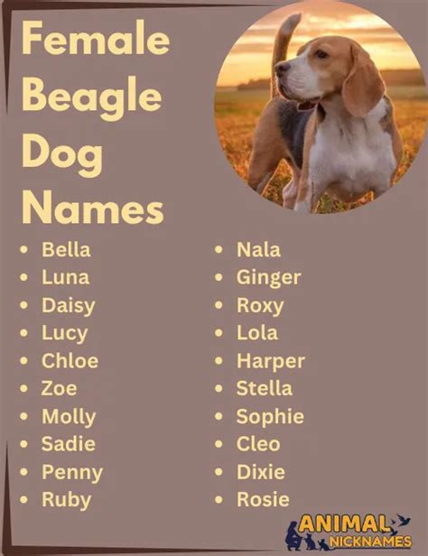 Beagle dog names inspired by nature Best female beagle names adorable and elegant, find the perfect name for your girl beagle puppy that will have everyone cooing over her at the dog park. When choosing the names for a female, you must choose a name that reflects its beauty. Go through the below list and choose your best girl puppy name for your.