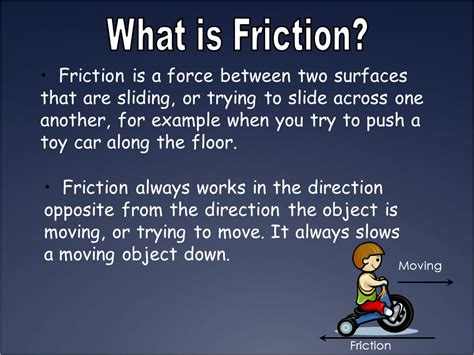 Let's learn about friction wi. Kids definition of friction 1 : Friction is the resistance to motion of one object moving relative to another. Motion that repeats is said to occur in a pattern. It is caused by the deformation of the wheel or tire or the deformation of the ground.